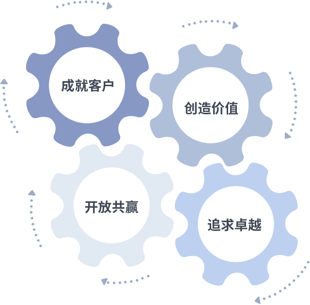 成就客户是一切决策的出发点,,,创造价值是衡量所有工作的标准,,,,追求卓越是我们做事做人的态度,,,,开放共赢是我们的格局也是最终的结果。。。。价值观的齿轮环环相扣,,,,推动着组织里的每个人不断向前。。